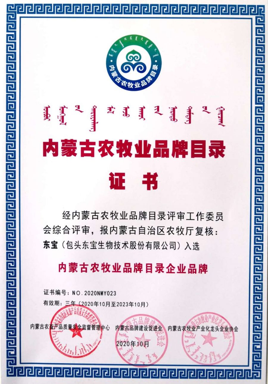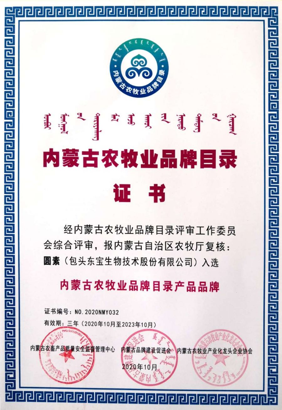 近日,內(nèi)蒙古農(nóng)牧業(yè)品牌目錄發(fā)布會在內(nèi)蒙古國際會展中心成功舉行,自治區(qū)農(nóng)牧廳和有關(guān)部門領(lǐng)導(dǎo)、組織實施單位負(fù)責(zé)人及品牌目錄企業(yè)代表近100人參加了發(fā)布會?,F(xiàn)場發(fā)布了內(nèi)蒙古農(nóng)牧業(yè)品牌目錄名單,東寶生物的“東寶”和“圓素”成功入選,作為內(nèi)蒙古農(nóng)牧業(yè)品牌代表并頒發(fā)了證書。