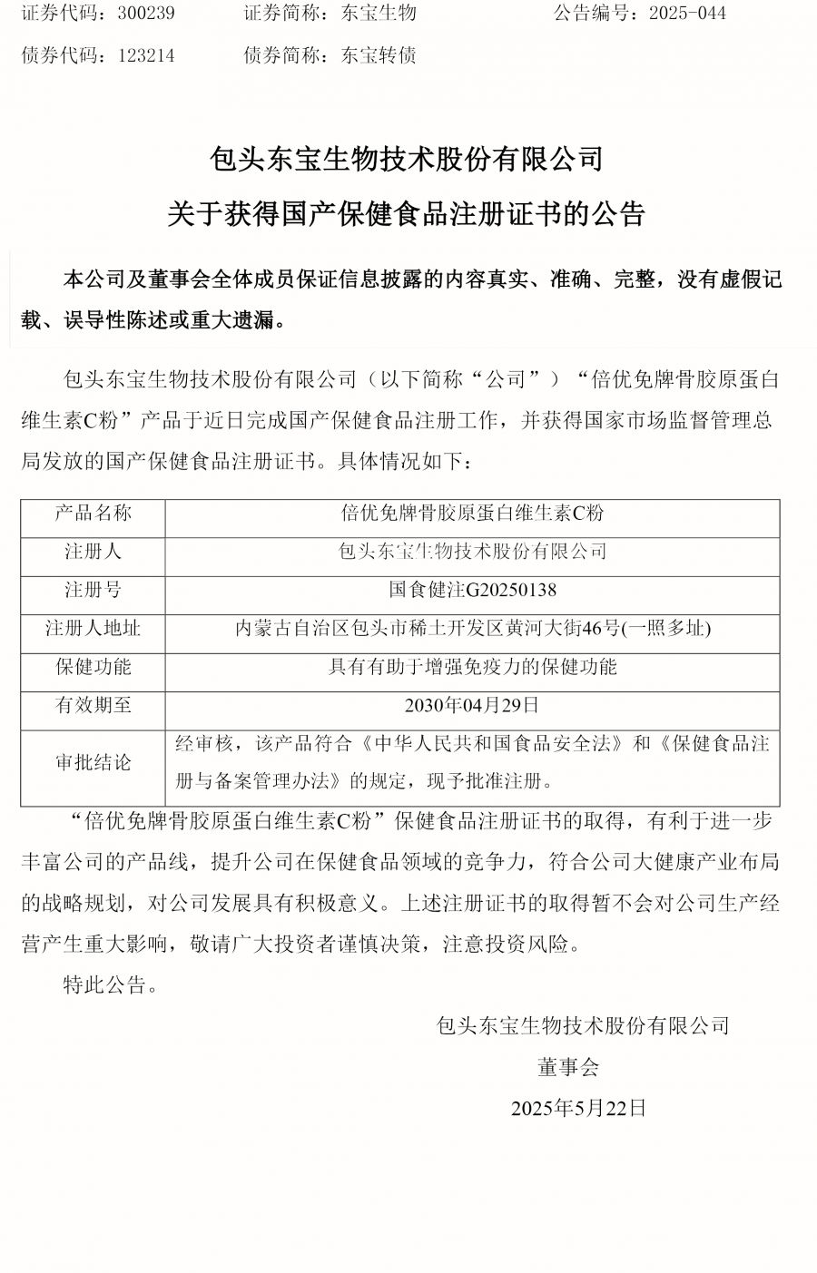 包頭東寶生物技術股份有限公司關于獲得國產(chǎn)保健食品注冊證書的公告